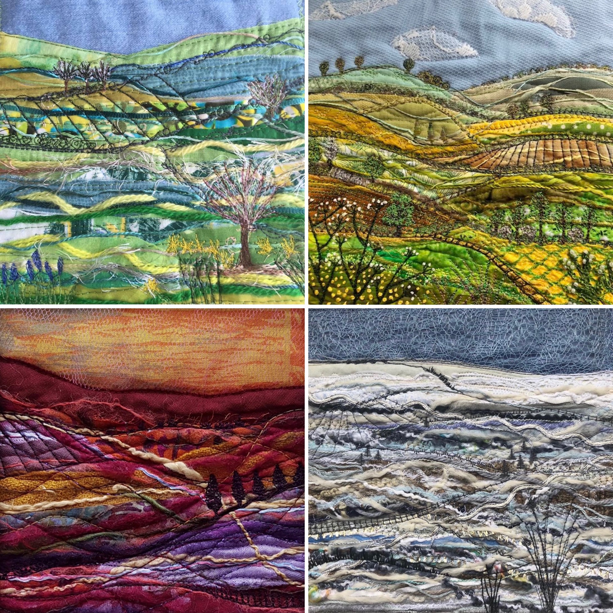 You'll need a handful of fabric scraps in wintry colours, a piece of felt or some some light quilt wadding, a piece of stabiliser, and a piece of water soluble fabric. Textured and glittery yarns - particularly frosty eyelash yarns - are wonderful for adding texture and detail to the landscape. A few machine threads (white, black, grey and silver), are all you need for the stitching.